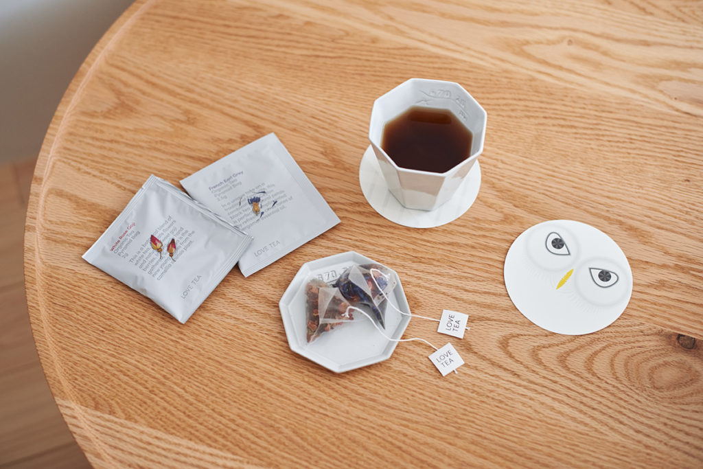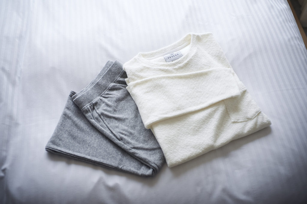⻭ブラシやコーム、カミソリには環境負荷を抑えアップサイクルも可能な新素材・LIMEX製のものを採⽤。カップは「KIKOF」、ティーセットはメルボルン発のオーガニックティー「LOVE TEA」、バスアメニティは京都発のオーガニックコスメ「NEMOHAMO」、タオルは今治の「ROYAL-PHOENIX of the seas」と、「TETELA」のルームウェアで⼼地よさを追求。