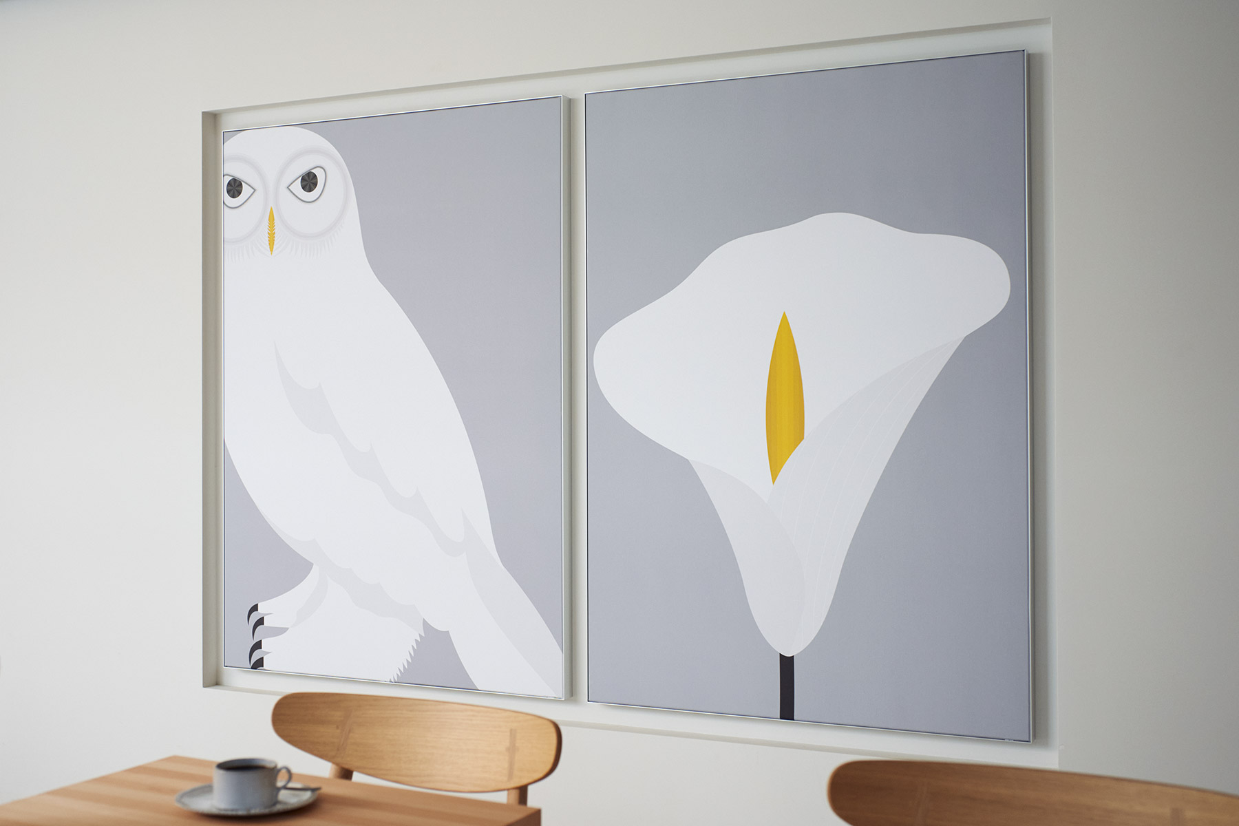 このふたつの絵を並べることで⻩⾊い嘴(くちばし)と⻩⾊い⾁穂花序(にくすいかじょ)が呼応し合い、美しさを引き⽴て合います。1階のカフェにこれらの⼤きな絵を飾ってあったり、外階段には⽩いフクロウの照明を設置しました。コースターやレターセットなどにもこれらのグラフィックを展開しています。